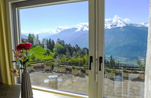 The large apartment house "Eglantine" in Aminona, Switzerland offers a beautiful garden to relax with a barbecue house and children's playground. It features amenities like a yard, Internet Wifi, and parking. The property is situated on the outskirts of Montana, just 4.7 km from the center, with a sunny and south-facing position, making it an ideal vacation rental.