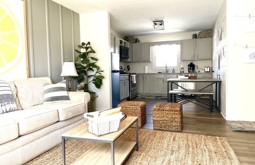 The Little Lemon Lounge is made up of 2 bedrooms with comfortable queen memory foam beds in each, and 1 full bathroom with a full sized washer and dryer inside for all your laundry needs. The suite is very stylishly decorated and has numerous thoughtful touches throughout to make you feel right at home. The eat-in kitchen includes granite counter tops, stainless steel appliances, and all the basic cookware, dishes and flatware necessary to create delicious meals for evenings in. You will also find a K-cup coffee machine and toaster for mornings on the go. The open floor plan allows you to enjoy the company of your fellow guests in the living room while watching TV on your favorite personal streaming subscriptions together.