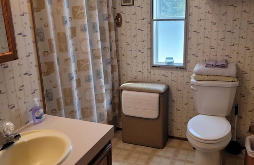 2 Bedrooms -Full Kitchen - 1 bath with tub/shower -washer and dryer - sleeps 8 Bedroom 1 queen bed - Bedroom 2 - 2 sets bunks - All bedding and linens are furnished. Kitchen with microwave, stove and refrigerator Gas grill on deck, table and chairs and fire pit in backyard