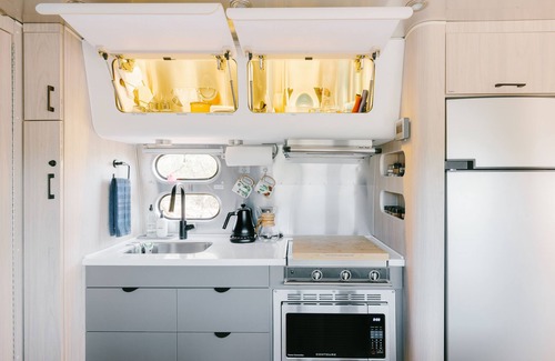 Whether you plan to cook or just reheat leftovers, the Airstream provides a well-stocked kitchen with a fridge/freezer, induction burner, propane cooktop, convection oven/microwave, electric kettle, spices, tools and more. To help get your day started, we provide a starter supply of organic coffee and multiple ways to brew your perfect cup of joe with a Chemex, automatic drip, or Aeropress. And the locally sourced, hand painted coffee mugs are the perfect compliment to your morning routine!