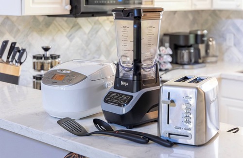 selection of small appliances, including rice cooker, blender, mixer, and toaster. You’ll find plenty of