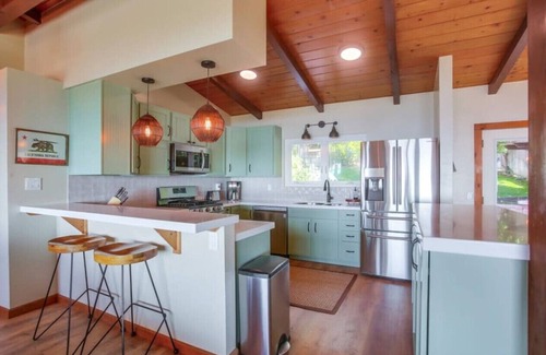 Large front windows allow you to enjoy a panoramic view morning, noon and night. Cozy and rustic living area is perfect to settle in and watch the world! Located in the quaint town of Cardiff-by-the-sea, this home is perfectly situated to enjoy 2 magnificent beaches (Cardiff and Moonlight), great restaurants, shopping and activities are within minutes! Relax in the hot tub and take in the sunset, lounge in the hammock out front or chill on the backyard sofa, this home offers many spots to kick back! Chill and grill in the backyard with the gas bbq, firepit and outdoor dining area. Surf shower and beach towels are available for your use. Large and open kitchen living area make for a relaxed atmosphere. If you are inclined to cook, the kitchen is well stocked.