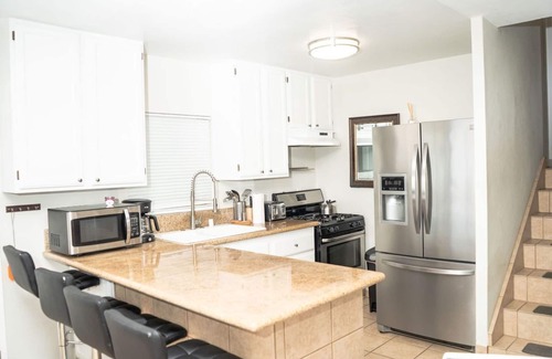 Contemporary Ocean Front beauty. Managed by seasoned 5 star property host. Ground floor condo elevated above the Mission Beach boardwalk. Step right out onto your patio lounge above the boardwalk. Sleeps up to 9 comfortably in two large bedrooms and living room (or up to 10 with kids). Includes 5 beds and a sleeper sofa. Each bedroom has its own private full bathroom. The condo was just filled with new furnishings. Easily accessible by family of all ages. Main entrance with no stairs. Beach entrance with just a couple stairs. Granite countertops, stainless steel appliances. Short walking distance to all the action yet well buffered from it. Two to three minute stroll along the boardwalk to Belmont park and all the eateries/restaurants, but private, quiet, peaceful and luminescent.