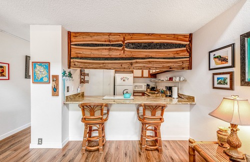 This home offers the utmost comfort with air-conditioning units and a new ceiling fan and lights on the lanai. Stylistic details and local touches include a reclaimed koa wood headboard, a sugi wood accent wall, and antique Hawaiian furnishings and artwork. The open-plan living area has high ceilings and incredible natural light. Unwind while watching your favorite shows on the 55” cable TV equipped with a DVD player. Prepare tasty meals in the well-equipped kitchen, complete with a full suite of appliances and ample granite countertop space. Perch at the breakfast bar for coffee or an afternoon snack. Or enjoy alfresco meals with a view - the private lanai has seating.