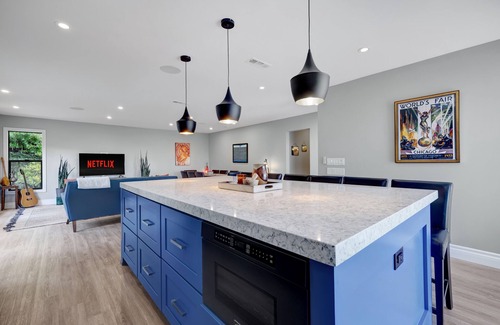 This luxurious hilltop home near the beach offers panoramic ocean views and a peaceful backyard oasis! Fully stocked kitchen, spacious and open dining/living area, lots of natural light, high-speed internet/Roku TV. Enjoy a nice dinner outside on the patio, swim in the private pool, relax on the swing, enjoy a glass of wine on the top deck and take in the views of Mission Bay down to Sunset Cliffs! Near La Jolla in a safe, quiet area close to dining & attractions! We’d love to host you!