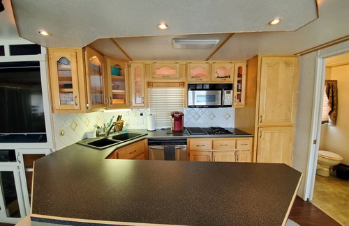 This houseboat is a 2 bed, 1.5 bath with full kitchen/bar and relaxing livingroom. Off the front you have a covered patio with a ceiling fan and the spacious roof top deck with a complete bar top and fridge with great views of the bay.