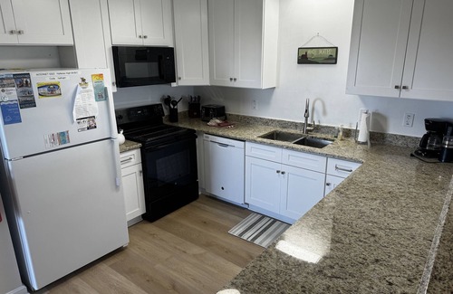 Wonderful ocean vistas from the kitchen/living room, master bedroom, or the private covered outdoor rear deck . The Kitchen has all new (2024) cabinets along with Granite countertops. The flooring has been completely updated (2024) and replaced as well. It has a Well-supplied Kitchen with Microwave, Ice Maker, Coffee Maker, Blender, all the comforts of home. All new range, refrigerator, and microwave in 2021. New 55" 4K TV in living room, plus a TV in the Master Bedroom. A sectional sofa with a queen-sized sofa bed is in the living room. The Master Bedroom has a Casper King bed. The second bedroom has two twin beds. The sliding glass doors have been replaced with new doors with wonderfully clear glass to view the surf. Both Bathrooms have been renovated in 2022. The pool, which is open from the mid of May through the second week of October, is just in front of this unit, making it easy to watch the children and family. On a private drive, but located near shopping, eateries and the fishing pier. It offers all the amenities wanted in a holiday unit. A full kitchen, an open dining/living room, Internet, and all the other comforts of home! The private covered rear deck has four Adirondack high chairs, offering a great spot to relax and watch the waves. Other niceties include outdoor showers, picnic tables, charcoal grilles, fish cleaning station, walkway over the dunes to a pretty beach. There is even a nature trail and pond!