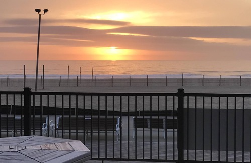 Welcome to Golden Beach Condominium on the Boardwalk between 3rd and 4th street. Enjoy all the comforts of home in Unit 101... it's a 1st floor ocean-front end-unit condo ON the Boardwalk. Completely renovated with all new furnishings, stainless appliances, quartz countertops, luxury plank flooring throughout & all amenities. Fully stocked kitchen (cookware, bakeware, glassware, utensils etc.) Open-floor plan. Ceiling fans in all the rooms. Kitchenette/dining area and bar seating. Two bedrooms; two queen-size beds; pullout queen sleep sofa; Two full bathrooms. Flat-screen televisions with cable, blu-ray and high-speed Internet access. New full-size washer & dryer. Bed linens, sheets, pillows, bath towels and kitchen towels PROVIDED. Private patio with high-top seating table and private 25'x50' deck with picnic tables perfect for relaxing, entertaining or just people watching. A few steps down from your elevated deck and you're onto the Boardwalk and steps from the beach/ocean. Conveniently located to many attractions, concert venues, shops, restaurants, and bars/nightlife. Boardwalk, Uber/ Lyft and buses are easily accessible. Elevator. Two reserved private parking passes in the condo lot with surveillance cameras.