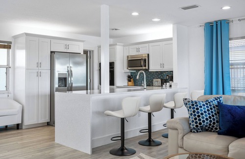 The kitchen with granite counters and stainless steel appliances. Leave the dishwasher to work on cleaning up as you watch the sunset, before heading to one of the three bedrooms for bed. Between a king-size bed and sofa-bed in the master bedroom, and another king-size bed in the second room, and full size double bunk bed with one extra twin size trundle in the third bedroom. Everyone will have a lovely place to sleep. There's also a laundry for your convenience.