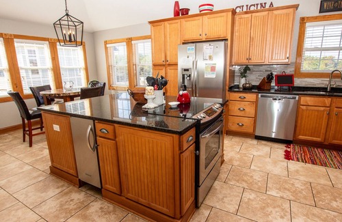 Top Level: Great room with flat screen smart TV, Blu-Ray DVD, furniture and game table seating 6, kitchen with counter seating for 5 and double dishwashers, dining room seating 10, breakfast nook seating 4, Ships Watch, half bath and a covered porch with picnic table for outside dining. King Master Bedroom with smart TV, newly remodeled private bathroom and deck access.