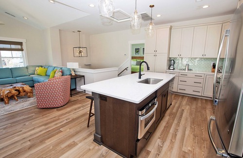 Top Level: Great Room with flat-screen TV, kitchen with counter seating for 4, dining area seating 8 with deck access and a half bathroom between levels. King Master Bedroom with flat-screen TV, private bathroom and private deck access.