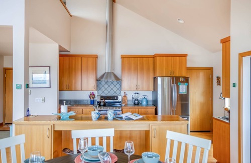 Prepare for serene ocean views splashed with Pacific light in the spacious Horizon View, a luxurious, beautifully appointed custom home in a quiet area with access to a fantastic, remote beach north of Neskowin. Both bedrooms are downstairs with two bathrooms and a media room, making this a wonderful home to share with another couple or spread out with the family. The patio introduces you to the outdoors including a hot tub, landscaped yard, and amazing ocean views. Since it backs up to forest land, you’ll enjoy privacy and glimpses of wildlife from the neighboring Nestucca Wildlife Refuge. Nearly every room has an ocean view and the home is next to public beach access on Winema Rd, which is a 1 mile drive away and there is public parking available.