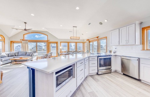 OCEANVIEW Avon — Ocean Isle Estates — Life is a breeze when you settle into AVON SEA BREEZE for your Hatteras Island vacation, as this beautifully updated seven-bedroom/six-full and two-half-bath home has everything you need to fully relax, recharge and revel in the memorable moments this lovely contemporary setting will inspire.