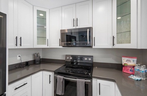 The kitchen is fully-equipped, so you can cook meals just like you would at home. The countertops are spacious, and the appliances are new and easy to use. You’ll have everything you need to prepare your favorite dishes and enjoy a home-cooked meal.