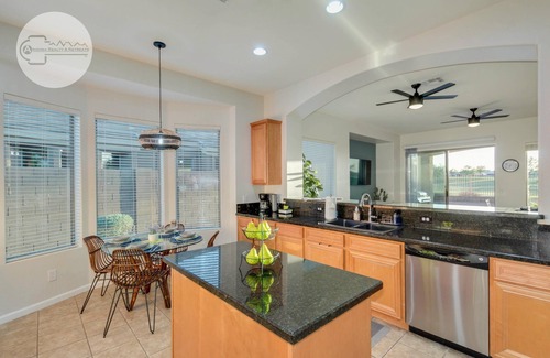 Start your day off right by rising early for a few laps in the sparkling heated pool, then soak your weary body after a long day in the massive hot tub! Work on your short game with a private 3 hole putting green,, or enjoy total outdoor living while watching the big game or making smores over the natural gas firepit! The chef in you will love the outdoor kitchen with BBQ grill, fridge and ice maker and with plenty of outdoor seating options, there's no better place to take in the magnificent Arizona sunsets than from this amazing property.