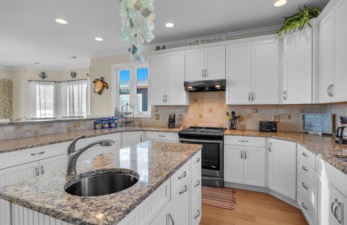 The open concept living area is flooded with natural light and features cathedral ceilings. Gleaming hardwoods, sandy neutrals and pops of fun color and nautical décor complete the beachy feel. Gather together across from the large flatscreen TV to share a favorite movie or watch the big game. The sturdy round dining table is set for six, with extra folding chairs in the closet and an additional four seats at the adjacent breakfast bar. The modern kitchen provides plenty of counter space for meal preparation including a center island and stainless-steel appliances. A half bathroom is located off this space for convenience.