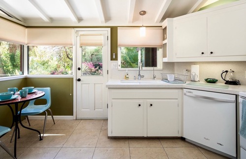 Casa Palma is an authentic MCM bungalow on three secluded lots with numerous shaded seating areas and lovely mountain views. A delight for bird watchers! Renovated to retain its original vintage charm while providing all the modern comforts of a cook’s kitchen, open plan living room, bathroom with large shower, A/C, luxury bedding, and high-speed internet.