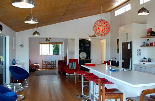 In the house at this Onetangi Accommodation, bedrooms 1 and 2 each have a queen bed. Bedroom 3 includes 2 single beds. There is also a sofa bed in the lounge when required.