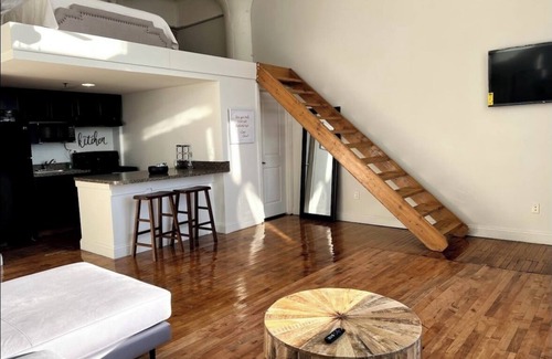 Keep it simple at this peaceful and centrally located authentic industrial loft. Our loft is located just 2mins outside of Downtown in an up and coming area. Sits on corner lot directly adjacent to a private River Walk and bike trail. A 5 min walk, and you're at Detroit's famous Green Dot Stables for the best sliders in the city! Spend your date night downtown.