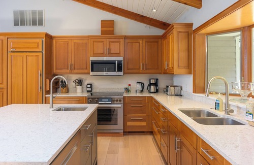 After a day of exploring the island, hiking coastal trails, or wandering through town, come home to unwind in the spa-like soaking tub—perfect for melting away stress and sore muscles. Then step out onto the expansive west-facing deck where you can grill up dinner on the BBQ, gather around the gas fire table for s’mores or stories, and watch the sun set in a blaze of color over the sea.