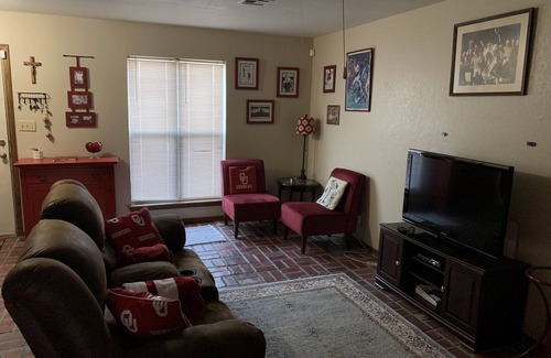 This 1970s era two-story townhouse only 1.6 miles from the main campus. Easy access to athletic facilities and other campus buildings such as the OU college of fine arts or music. 2.8 miles to Lloyd Noble Center. The townhouse is located in a quiet area that is close, but not too close, to campus. Perfect for a couple that wishes to visit Norman or the University of Oklahoma. The townhouse is protected by Ring Doorbell for security and has a small office upstairs with WiFi access available. Very short and inexpensive ($5) Uber ride to Campus Corner if you'd rather not drive and worry about parking.