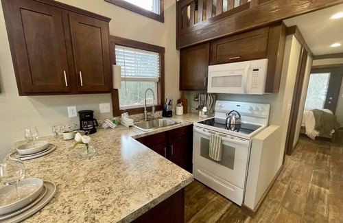 Enjoy a spacious deck, private firepit strung with lights, an electric fireplace, and a full kitchen. With TVs in both the master and living areas, it’s equipped for comfort.