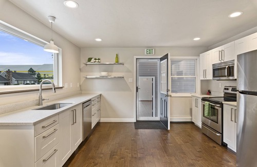 The house has a brand new kitchen and great room concept. There is a 55" TV in the great room as well. The split level plan has upper and lower levels that each have 2 bedrooms and a full bath. There are 3 bedrooms with queen beds and 1 with 2 twins. The basement level is the 5th bedroom with a 40" TV and 3 twins. There is also a washer and dryer. Great finished garage with a TV to hang out in!!! WIFI as well.