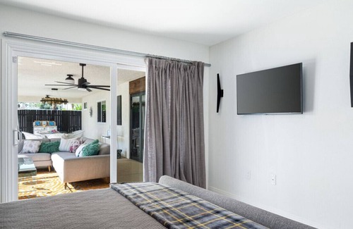 Mid-Century Modern, thoughtfully designed by Austin Interiors 2022, completely remodeled home with open concept and collapsing glass wall to patio and pool to enjoy indoor/outdoor living. Historic Deepwell Estates is known foritsamazing mountain views. 420 friendly. New pool & spa. Patio w/ firepit. Gas fireplace.Jacuzzi indoor tub. 3 King Beds. Fully stocked kitchen. Wine cooler. Outdoor BBQ. 5 blocks from 111. Walk 3 blocks to Starbucks, stores, & restaurants. Fun and safe for your pets.