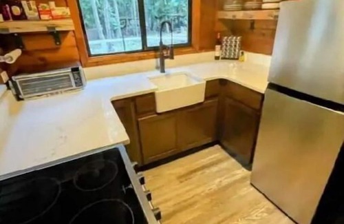 The farmhouse sink includes a tall pull down sprayer faucet for those intimate meals when you don't feel like going out to eat (once you are in the cabin you will not want to leave!) Cooking can be done inside with the electric range, air fryer, or use the deck propane grill. The dining room is located between the kitchen and living room and features a kitchen table with seating for five or six.