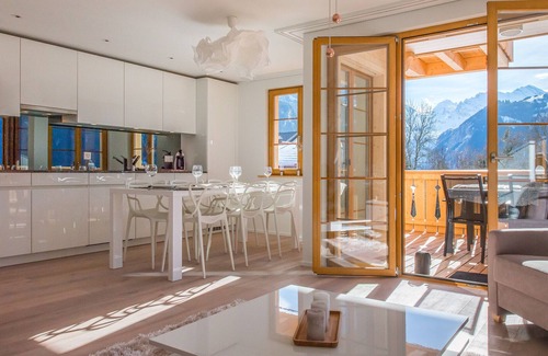 The open plan living-dining-kitchen features Designer furnishings and opens out on to an extensive balcony with views of the Jungfrau, Silberhorn, Breithorn, Lobhorn and surrounding mountains. A sauna on the balcony and outdoor dining for 6 people makes the most of the vistas ensuring your Wengen holiday is one to remember.