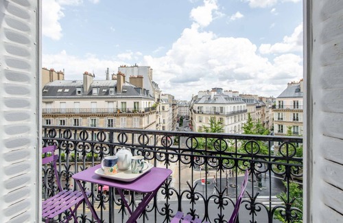 Tucked away near Saint-Lazare, our top-floor apartment with an elevator features a wrap-around balcony for panoramic views. Perfect for two couples or a family, it includes 2 bedrooms, a spacious living room, and a fully equipped kitchen. Enjoy a secure, bright, and peaceful setting, with easy metro access to explore Paris. An ideal blend of modern comfort and Parisian charm, for a memorable experience in the heart of the city.