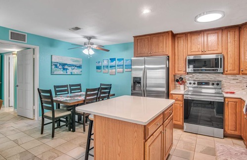 With its fully stocked kitchen, stainless steel appliances and large island you can make a gourmet meal after a long day at the beach. The dining area seats six comfortably with an additional two at the kitchen island. After a day at the beach and pool, you can kick back and relax in the living room while watching your favorite shows on the flat-screen TV. Enjoy the large patio right off the living area with afternoon shade to enjoy a drink of choice while taking in the gulf breezes. The sunset view is unmatched anywhere in Port Aransas.