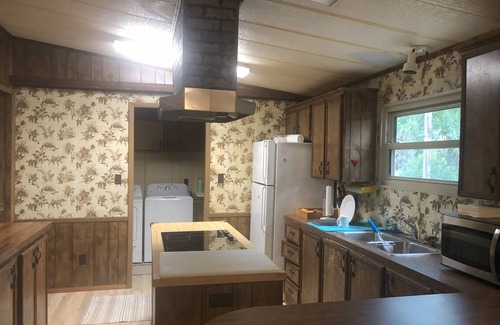 Comfy modular home that lives big, immaculately clean and well-maintained. Just as cool as your grandparents house with 1970s vintage finishings, but nicely furnished, with wi-fi and new smart TV with cable. New cooktop, new washer and dryer, new deck and new flooring throughout. Really a beautifully maintained house, just a bit groovy with original paneling and wallpaper. 3-head mini-split AC added in 2023.