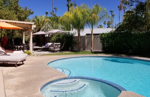 Tranquility abounds at this four bedroom, three bath ranch-style home located at the end of a quiet cul-de-sac in the less-windy south Palm Springs neighborhood of Los Compadres. A sparkling pool and spa are surrounded by beautifully landscaped grounds featuring mature palms against the vivid desert sky. Enjoy a completely private, quiet and relaxing desert paradise.