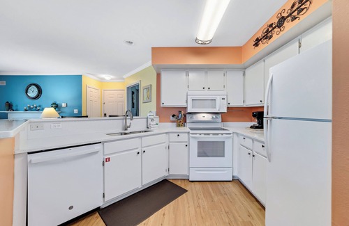The dining area provides comfortable accommodations for six guests, four at the dining table and additional seating at the bar. The well-appointed kitchen is equipped with everything you need to prepare and enjoy delicious home-cooked meals, and the dishwasher and disposal make cleanup a breeze. A washer and dryer are located in the laundry closet for your convenience.