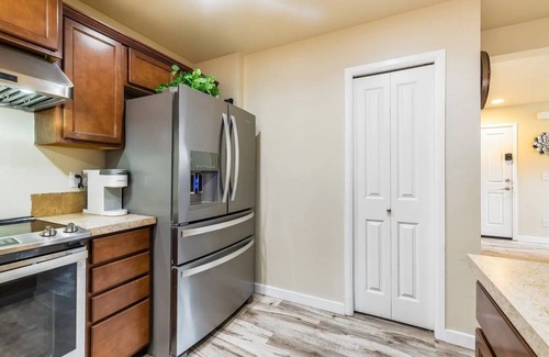 Recently upgraded and beautifully furnished throughout, this private four bedroom home features an open floorplan with wrap around kitchen, counter-height seating, dining room, dedicated office space and living room with 55" HDTV. Fully appointed kitchen with appliances, including stove, oven, refrigerator, dishwasher and microwave. Bedrooms are comfortably furnished with beautiful crisp new linens, pillows and bed coverings. Master bedroom includes walk-in closet, massage chair, private en suite bathroom and 43" HDTV. Spacious living room with comfy sofa, Smart HDTV, laundry area, private backyard with patio & furniture, BBQ, free high-speed Wi-Fi, onsite parking and key-less access.