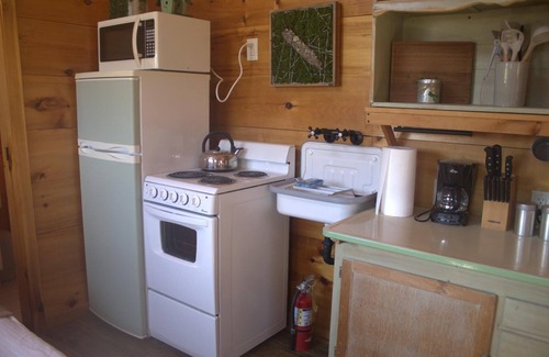 Our cozy cabin comfortably accommodates 2 guests with a queen-size bed, and an air mattress is available to sleep 2 additional guests (better suited for children). Start your day by preparing a delicious breakfast in the kitchenette, featuring fresh eggs from the farm—just ask the host for details! The cabin features a bathroom with a shower, stocked with towels, shampoo, conditioner, and a hair dryer for your convenience. Savor a cup of coffee as you take in the beautiful views and experience all the farm has to offer.