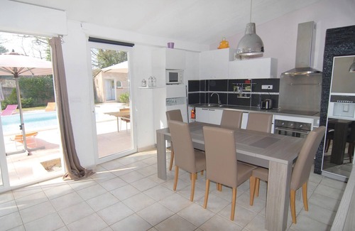 This spacious vacation home for up to 10 people has four bedrooms and a spacious living room with American kitchen. It enjoys a quiet location on a garden plot of over 5,000 m² near Aix-en-Provence and the Sainte-Victoire mountain. A trampoline and a table tennis table are at your disposal. The swimming pool, which is completely hidden from view, is heated so that you can benefit from it as early as April and up to and including October. The heating costs for the pool are included in the rent. In an annex there is a second kitchen, a living room and a bedroom with bathroom, and a few meters away another annex includes a shower and a toilet. There is also an outdoor shower there. You can enjoy the nice weather on several terraces, and the house has a boules court. For barbecuing, both a gas and a coal grill are at your disposal. Due to the two American refrigerators, there are always ice cubes for cold drinks. Park your cars on the closed property or in the carport. 2.5 km away, the typical Provencal village of Trets awaits you with restaurants, supermarkets and bakeries. Via the highway you can easily reach Aix-en-Provence (25 km), Marseille (45 km), Aubagne, Cassis and its rocky bays and the beaches at La Ciotat. The many wine châteaux around the vacation property invite you to wine tastings.