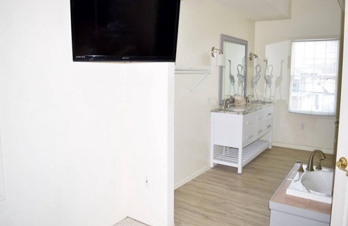 Pet Friendly! Upon entering this home the first floor has a large open floor plan with the living area, dining area, and kitchen. The living room has a large flat screen TV and a sofa bed. The kitchen has been updated with newer countertops. The second floor has 3 bedrooms. Bedroom one has a king bed and an en-suite bath with double sinks and a large jacuzzi. Bedroom two and three both have 2 single beds in each. There is second living area on this floor with plenty of seating and a large TV. There are TV’s in every bedroom. There is another full bathroom on this level as well. There is a loft above looking over to the second floor living area that has a queen bed. 2 off street parking spots.