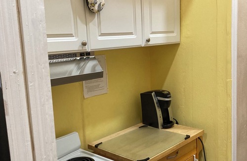 ✔ Keurig coffee maker, electric tea kettle, and a selection of coffee and tea