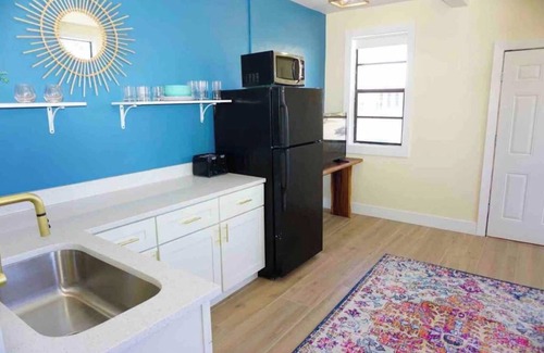 Private apartment with a gorgeous quartz countertops, soft close cabinets & fully stocked kitchen. There is a portable 2 burner cook top, microwave, coffee maker and all utensils and cookware needed for a great meal! In the bedroom, you will find a large walk in closet a high end plush memory foam queen bed with cooling technology & an en suite custom bathroom! Everything is new at this fully renovated apartment!