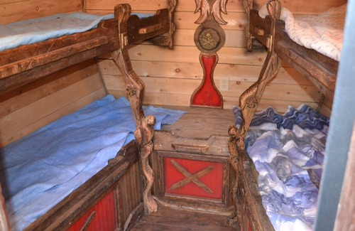 Note: Captains quarters and the crew bunk room are a short walk across the lower deck outside from each other- about 15 feet. They are not connected. Be aware that the theme of the ship MAY scare younger pirates so much that they will NOT want to stay here. We have skeletons and an area that is remote and scary to younger children.