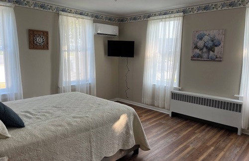 Enjoy serene country life when visiting this charming farmhouse surrounded by panoramic views of fields and mountains. Your home away from home offers 4 bedrooms and a cozy living room with 2 sofa beds, perfect for unwinding after a day of exploring. Bedrooms consist of a mix of bunk, twin, king, and queen beds to ensure a good night's sleep for all guests. Two bathrooms with showers and hair dryers provide convenience for your stay. Our beautiful dining room features seating for 16 guests Enjoy a movie in our unique theater room with reclining theater chairs. Unwind in the hot tub while the children enjoy playing games. Basketball, volleyball and bicycles can be enjoyed by all. Enjoy all that New Enterprise has to offer when you stay at our farmstead.