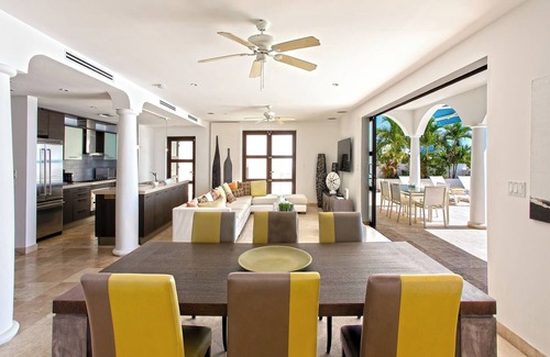 This award-winning villa is part of a prestigious gated community with some elegant interior designs. It holds four gorgeous bedrooms; one bedroom on the main floor and three suites (including the master bedroom) are located on the second floor. The overall floor plan of the luxury St Martin villa rental is that the main floor offers a lovely open floor design that showcases a state-of-the-art kitchen, a high-end dining area, and an expansive living area with a modern, flat-screen TV that delicately sweeps out to the scenic pool terrace with the shimmering blue pool where you can enjoy the unparalleled views of the Caribbean sunsets on the expansive terraces and verandas. With clean lines, and expansive, open floor plans, this Caribbean-style villa is as beckoning and breezy as the Caribbean itself.