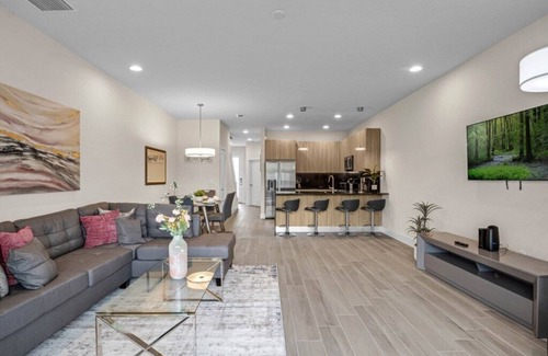 !!!Please contact us for monthly specials (up to 3 months)!!! Welcome to the Cozy Modern Contemporary Villa near Disney! The home has 3 bedrooms & 3 bathrooms. Make your way through your dream vacation home, on your right you have a stunning queen bedroom (Big TV) with a ensuite modern contemporary bathroom that guest can enter from the hallway as well. Walk down to the great open floor concept of the kitchen, living room, and dining table. Great to socialize while cooking dinner/breakfast or keeping an eye on the kids. Open the sliding door to a covered lunai with plunge pool looking over the beautiful conservation. The plunge pool is perfect to cool down with Florida sunny days, keeping the kids busy, or relax after the parks. Walk upstairs to your main bedroom (king bed & big TV) with a big primary bathroom and huge walk-in closet looking over the conservation. Next, you have a loft great for the kids to watch movies and play. Lastly, You have a cozy twin bedroom (2 twin beds) fun for the kids and adults. BOOK NOW! *Pool heating is NOT included in the rental unless specified in your rate. Please contact us to get a quote. You can still use the pool without heating, of course. ** Only the guests who have been registered are allowed to stay in the property.* *** Pool heaters are set to 86 prior to your arrival. The reached temperature will depend on the weather. Pool heaters run 12 hours during the day. No refund or compensation will be given if the pool heater does not work unless the guests paid for the heating of the pool and it is proven that there was a technical issue that created an inconvenience. The refund or compensation will never exceed the amount paid by the guest for the heating of the pool.