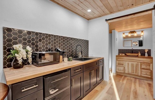 Have a relaxing stay in this charming cabin themed unit with modern amenities and tasteful décor, perfect to nestle up in on a snowy day as you watch the flakes fall gentle onto the pine trees around you.