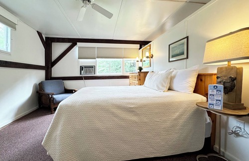 The original tree bark stairwell welcomes you to this second-floor apartment. Shaded by majestic willow trees, Apartment 22 is located at the head of our nature trail and is just a short walk from the lake.