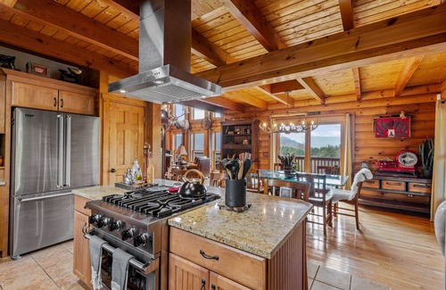 The main level opens to a great room with fabulous views. Leather seating surrounds the wood-burning fireplace and flat screen TV. The kitchen is outfitted for all your cooking and entertaining needs. The king suite on the main level has a gas log fireplace, TV, and a large, private bath with soaking tub, tiled shower, and vanity.