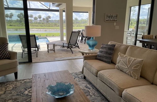 Welcome to your monthly rental retreat at Esplanade on Skye Ranch! This charming home boasts 3 bedrooms, including a luxurious King size bed and 2 Queen size beds for your comfort. Wake up to the most breathtaking sunrises and spend your days lounging by the private pool and hot tub, all while overlooking the serene wetlands and wildlife from the panoramic screened lanai. Feel free to unleash your culinary skills in the outdoor kitchen, perfect for al fresco dining and entertaining.