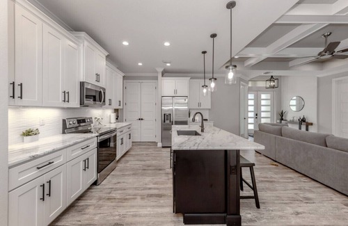 Enjoy meal prep with ease in a fully stocked kitchen featuring modern appliances, meal prep equipment, a coffee maker, and pantry staples. Dine at the island or gather at the full-sized dining table for memorable meals.